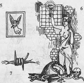 6. Обнаженная женщина с горящим факелом в руке, тюремная решетка, змея, крест, человеческий череп, топор, деньги. «Ничто не вечно в этом мире». «На все воля Божья». Татуировка лагерного авторитета. Может сопровождаться текстом о бренности мирского существования. Наносится только на грудь.
