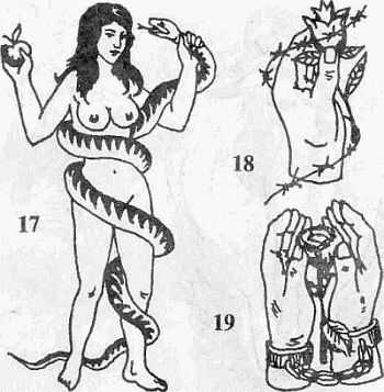 17. Обнаженная женщина, обвитая змеей, с яблоком в руке. Библейский сюжет о змее-искусителе. «На преступление толкнула женщина». «Женщина-искуситель». Наносится на грудь, плечо. Татуировка иногда встречается среди пассивных гомосексуалистов (обычно на спине).