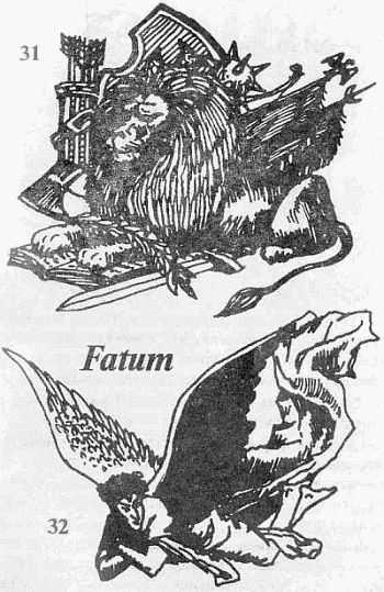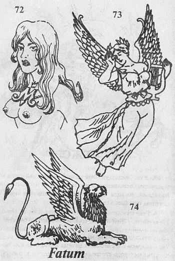 32. Летящий демон. Рисунок может дополняться надписью «Fatum» (рок). Наносится на грудь и означает жестокость. «Мой бог — злой Демон». «Грехи оплатит сатана». Встречается у быков, бойцов, отрицал.