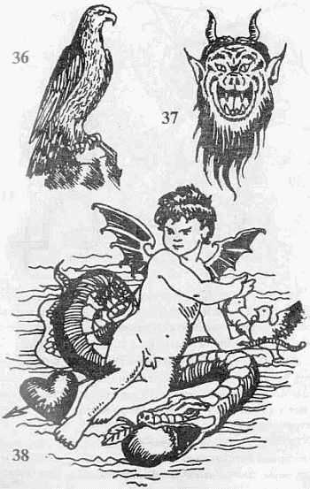 38. Амур с луком, змей-искуситель, голуби, пробитое стрелой сердце. Художественная татуировка. «Искушен тобой навеки». Наносится на грудь или спину.