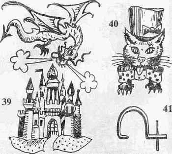 39. Дракон, летящий над замком. Татуировка встречается у расхитителей государственной или коллективной собственности, «цеховиков». Означает также полную конфискацию имущества. Наносится на грудь и спину.