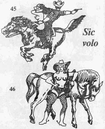 45. Ковбой с голой девушкой на коне. Рисунок может сопровождаться аббревиатурой «ОМУТ» («От меня уйти трудно»). Означает склонность к риску и авантюрам. Татуировка наносится на грудь.