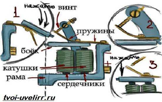 Движущая сила в приборах – электромагнитные катушки. Они по очереди притягивают и отталкивают стальной боек. В нем закреплена игла для нанесения узора.