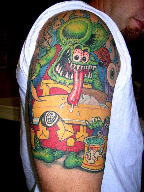 Также можно столкнуться с тату мультяшных автомобилей. Оригинальная идея, которая будет забавно смотреться на брутальном мужчине. Это выглядит очень модно и необычно.