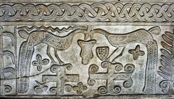Крышка реликвария с изображением Креста, овец и четырех источников. Римская империя. IV век. Италия. Чивидали дель Фриули. Собор Санта-Мария-Ассунта