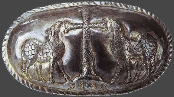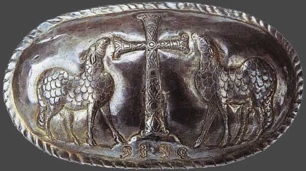 Крышка реликвария с изображением Креста, овец и четырех источников. Римская империя. IV век. Италия. Чивидали дель Фриули. Собор Санта-Мария-Ассунта)
