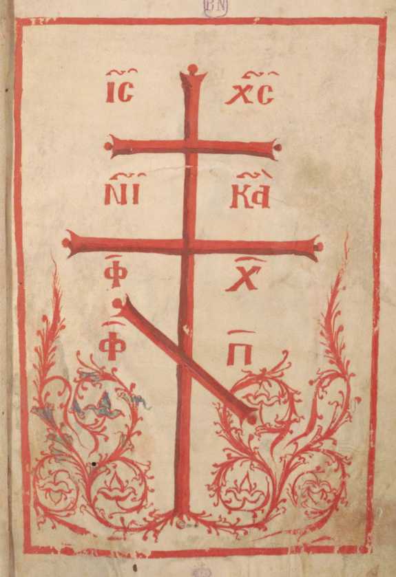 Крест восьмиконечный процветший. Миниатюра рукописи. Византия. XI век. Испания. Мадрид. Национальная Библиотека Испании