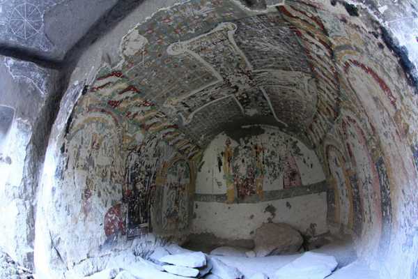 В Каппадокии одна из главных загадок – вот такие вот кресты. На потолке. В Ихларе они тоже есть. Вот в церкви Кокар, говорят, это – иконоборческий. Но это те ученые, которые только по фоткам изучают. Стоит только поле креста расширить на фото – и вот- святые, пророки, апостолы да сам Христос с Богородицей, какое уж тут иконоборчество…