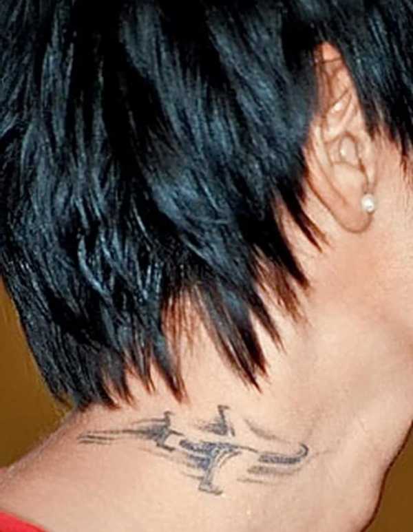 На шее у знаменитости располагается вытатуированный самолет. У этого эскиза также есть несколько значений. По мнению певицы, он должен говорить о ее далеко идущих планах и стремлении пробраться все выше и выше. Однако стоит рассмотреть и иные трактовки.