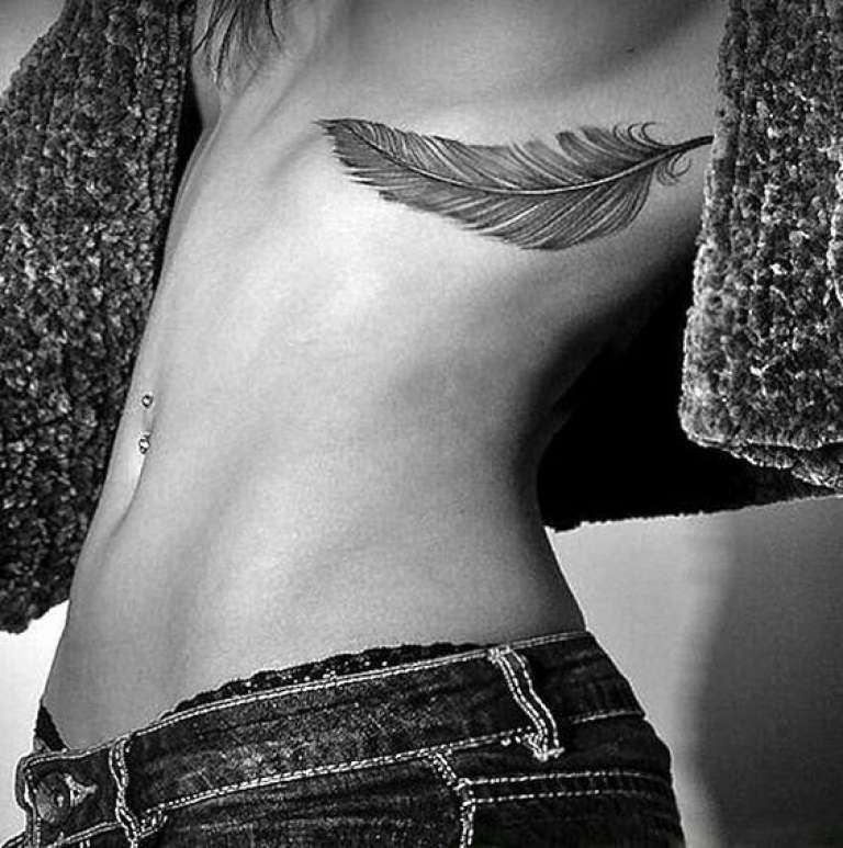 Татуировка на ребрах у девушек сегодня очень популярна, особенно это заметно в летний пляжный сезон. Основное достоинство такой татуировки – возможность выставить ее на всеобщее обозрение или же наоборот скрыть от посторонних глаз. Нательный рисунок на ребрах прекрасно подчеркнет красоту женской фигуры и пресса, поэтому зачастую татуировку на ребрах наносят спортсменки и девушки, поддерживающие спортивную форму в тренажерном зале. На женском боку замечательно будет смотреться татуировка в виде надписи, цветов, птиц или перьев.