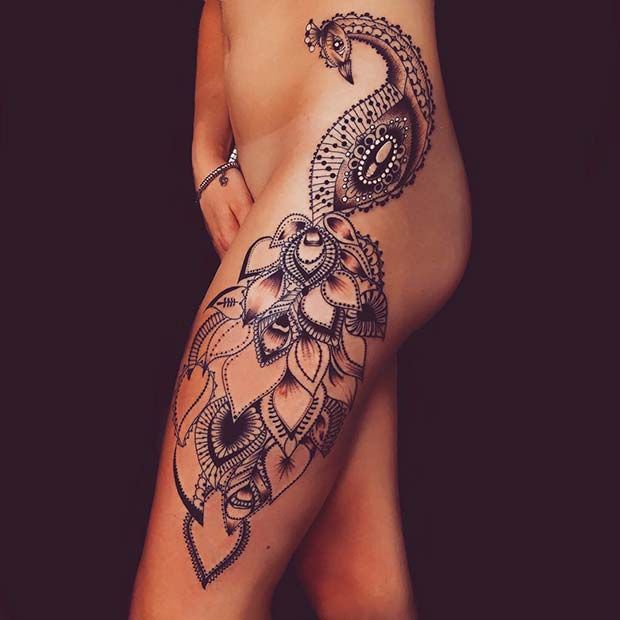 Черная мандала и татуировка цветка на правом бедре, доходящая до бедра. Если вы не уверены в цвете – не заморачивайтесь и сделайте контурную черную татуировку на бедре.