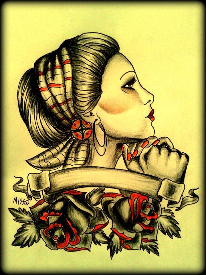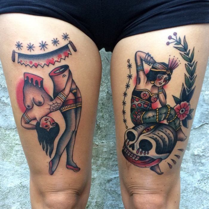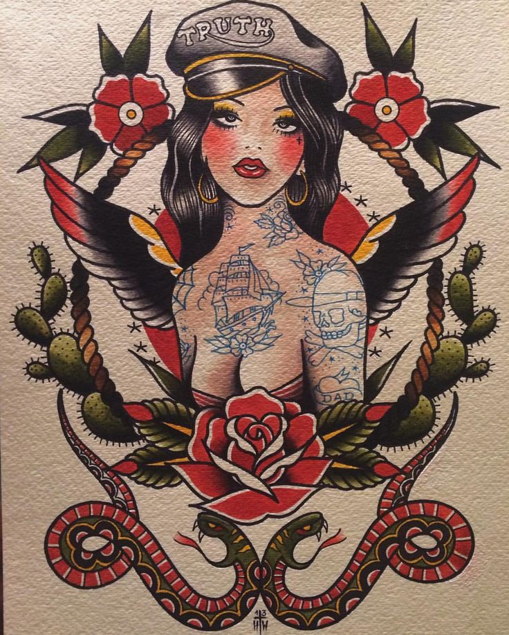 Большой успех между моряками или байкерскими бандами, один из дизайнов татуировок старой школы включает женщин, скудно одетых, позирующих вызывающе в татуировке. Обычно это использовалось, чтобы выявить похотливую сторону человека или просто как знак веселья, простой жест распутства, который был очень распространен в прошлом.