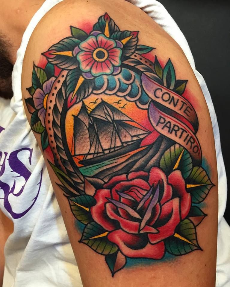 Помимо восхитительных рисунков, этот вид татуировок также имеет несколько значений. Для некоторых людей лодка говорит с владельцем, поэтому контур лодки в татуировке многое расскажет вам о них. Вода, по которой плывет лодка, по большей части говорит о жизни. В зависимости от задуманного сообщения вода в татуировке может быть бурной или гладкой, как и в сравнении с обычным значением, эти американские значения татуировок старой школы просто фантастические.